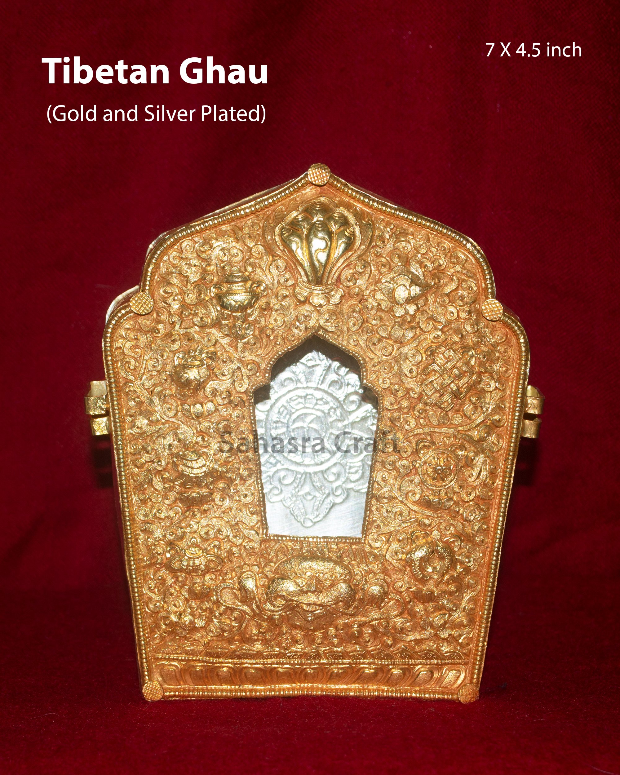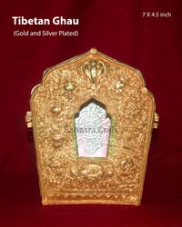 A Tibetan Ghau box is a portable shrine or amulet container used in Tibetan Buddhism to hold sacred relics, prayers, or small statues of deities. Typically made of metal—such as silver, brass, or copper—it is intricately decorated with auspicious symbols and gemstones. Worn as a protective talisman, the Ghau is believed to bring blessings, ward off negative energy, and serve as a personal altar for practitioners during travel or pilgrimage.